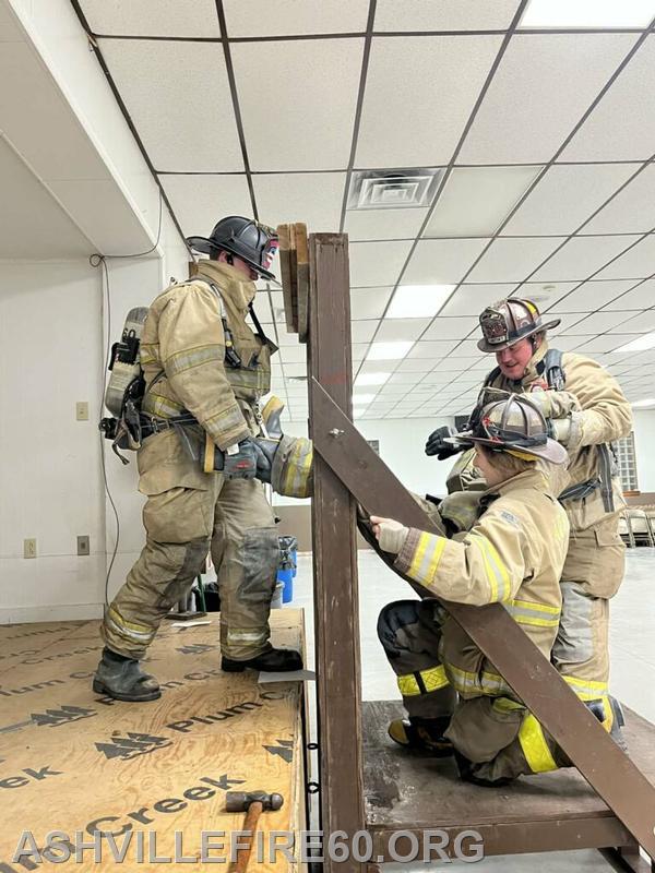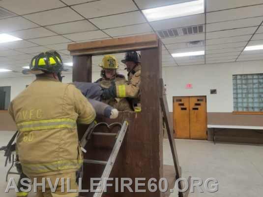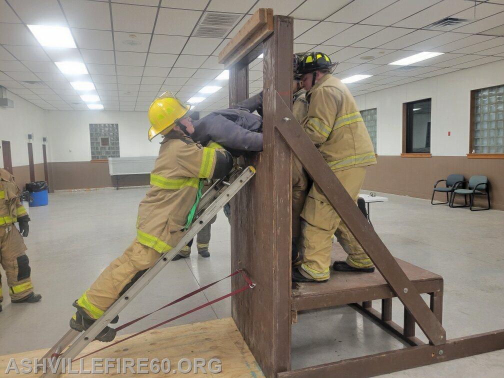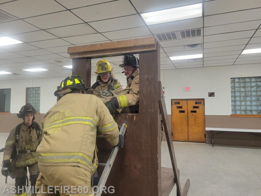 Members took advantage of our Tuesday night training to go over ladder placement during rescue operations, along with VEIS. (Vent, Enter, Isolate, Search) Utilizing a small room in our rec. hall to simulate a bedroom as well as our window prop. Starting with ladder placement and entering/exiting windows techniques, each person went through the evolution of entering the room via window, closing the door, locating the victim and getting them out the window to safety. Exterior crews used ground ladders to simulate bringing the victim down the ladder. -60 Pride- "Doin'What We Do...FOR YOU!"
