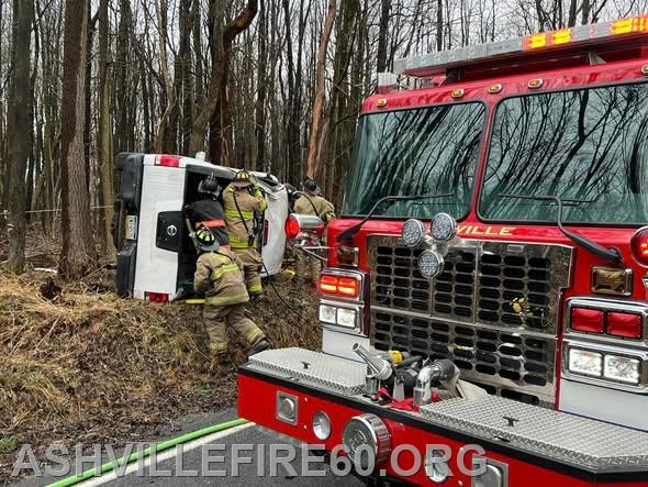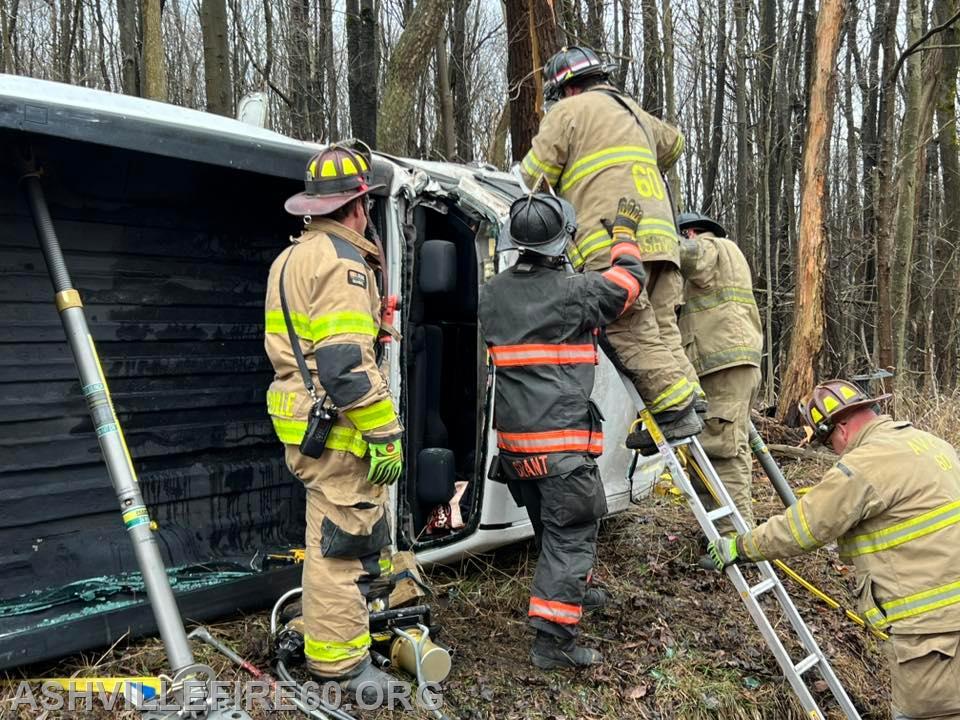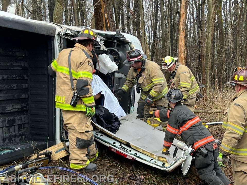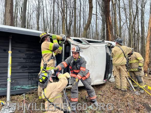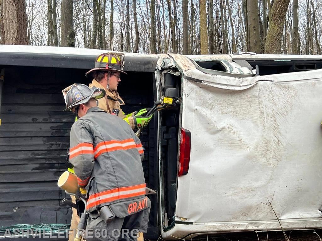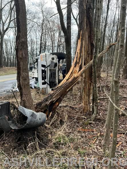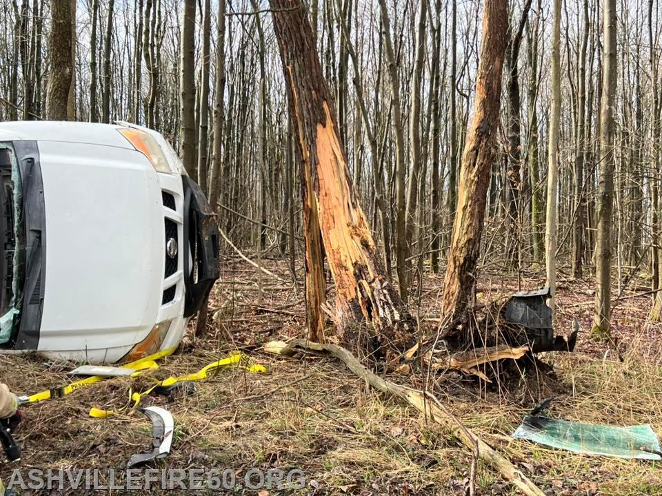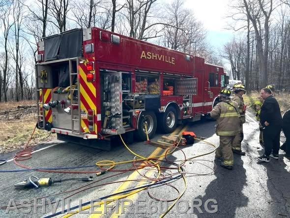 Station 60 was dispatched @09:09 on Good Friday for Motor Vehicle Accident with entrapment on the 1600 block of Black Snake Road in Dean Township. Chief 60 arrived on scene to find a pickup truck had rolled over and struck a tree, with a female confined to the cab. Rescue 60 arrived and went to work on stabilization, with the vehicle on its side resting at the edge of the embankment. The crew then used Hurst Rescue tools to gain access to the cab, removing the roof allowing for patient removal.